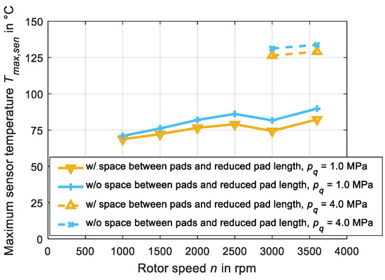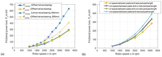 At the maximum investigated rotor speed of 3600 rpm in Figure 19a, the two-lobe lemon-bore bearing exhibits a frictional power loss that is approximately 2.3 the one of the OHB test bearing. As the lemon-bore bearing features a length of 500 mm, an additional prediction for a linearly scaled geometry and oil flow rate of the OHB test bearing to a length of 500 mm and a flow rate of 650 L/min was performed. According to Figure 19a, the improvement of frictional power loss considering the modified bearing length reduces to a factor of 1.6, but it is still significant, as the absolute power loss reduction is about 225 kW. To understand the impact of the single design measures in more detail, Figure 19b includes variations of the bore geometry. The predicted power loss values show the results for the nominal test bearing geometry described by Table 1 as a lower limit, and bearing geometry without the reduced length and the spaces between pads as the upper limit. Here, the positions of the lube oil pockets remain unchanged. Only the axial length of the pocket in the upper pad is adjusted to the one of the lower pad for the case of unreduced pad length. For maximum speed, power loss increases by 37.2% if the reduction in the pad surface area is completely neglected. A separation of the two measures provides a comparable impact on power loss. While the simulation with reduced axial pad length and without the spaces between pads increases power loss by 18.8%, the one without reduced pad length and with spaces between the pads shows a 16.4% higher value. Note, both measures interact with each other, and therefore, the sum of both values is not equal to the 37.2% that is achieved if both measures are present simultaneously. This level of relative deviation starts at 2500 rpm and is significantly lower for rotor speeds below 2000 rpm. Consequently, the applied modifications of the conventional offset-halves geometry are suitable for high-speed applications, but their benefit for lower surface speeds is less significant. The presented measures to reduce power loss are not accompanied by higher maximum temperatures. On the contrary, the optimized bearing shows lower predicted maximum sensor temperatures than the variants without the spaces between pads or reduced axial pad length, as Figure 20 depicts for the comparison with the variant that neglects both design measures.