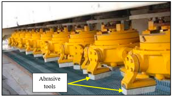Nowadays, stone polishing operations are performed using long polishing machines consisting of successive heads (Figure 1). Six abrasives are radially located in a head and passed against the stone tile surface. One of the main concerns of manufacturers regarding the polishing process is the wear and removal of the abrasive tools. According to previous studies, more than 40% of the product’s total costs are related to the polishing stage [2,3,4,5]. Many of these costs are related to the high rate of consumption of abrasive tools, because about half a kilogram is required per square meter of the final product [6]. Hence, it is imperative to identify the predominant wear mechanism and investigate the effective parameters on the wear of the abrasive tools.