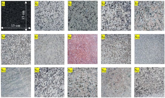 It should be noted that the term “granite” has two different definitions: scientific and commercial. Granite is scientifically defined as a crystalline and hard igneous stone composed of quartz, feldspars, and accessory minerals such as mica. In contrast, commercial granite covers all hard and crystalline igneous stones with different petrographic properties that can be polished well [19]. For all stone types, block samples with sufficiently large dimensions were provided by stone processing plants and brought to the laboratory for sampling and testing.