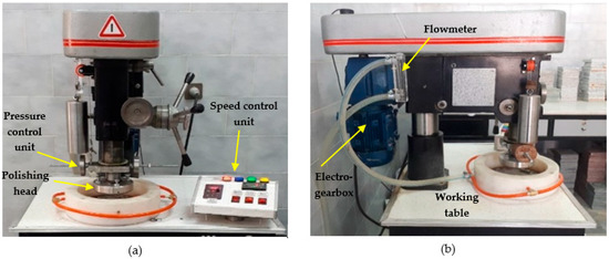 All of the abrasivity tests were performed in the laboratory, using the new abrasivity rig described in our previous publication [20]. Due to the novelty of the test, the new rig and the test method are explained briefly. The rig includes a working table, a polishing head, a pressure control unit, an electrical driving force unit (electro-gearbox), a speed control unit, and a water flow regulation unit (Figure 3).
