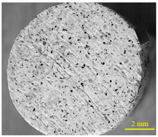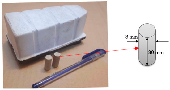 Cylindrical abrasive pins 8 mm in diameter and 30 mm in length were prepared from the abrasive block employed in the industry with the grit number 120, using water jet cutting technology (Figure 4). Based on the XRD results, the abrasive tool consists of silicon carbide (SiC) particles (5%), as abrasive material, bonded together by a magnesium resin (49%), as cement, calcium oxide (7%) and loss-on-ignition materials (39%). These results were obtained using an X-Ray Diffraction spectrometer (model: Shimadzu XRD-6100), by means of the parallel beam method with a scan angle between 10 and 100 degrees.