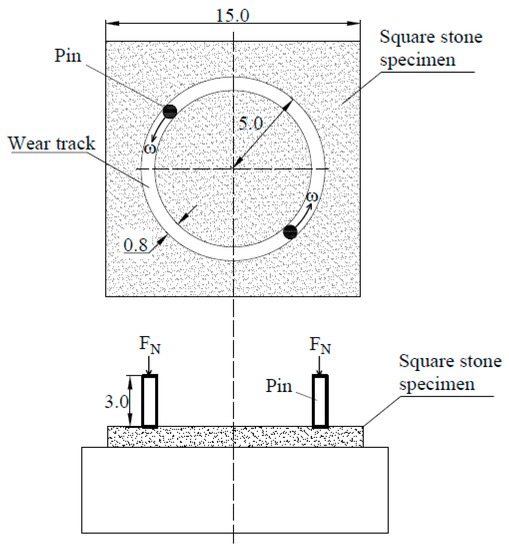 Two abrasive pins were used for each test and mounted in the rotating head. The experiment was performed on a square stone tile with a width of 15 cm and a thickness of 2 cm. It was located in the Teflon chamber and fixed by holders. Moreover, the stone tile surface should be planar and smooth (for this purpose, calibrated stone tiles with diamond abrasives could be used). Figure 5 shows a schematic diagram of the relative motion between the abrasive pin and the stone sample.