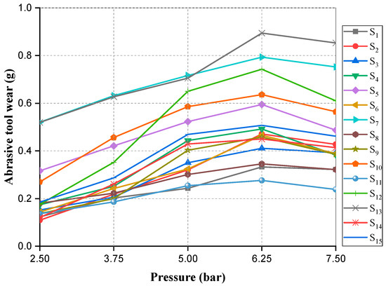 To understand the behavior of the wear phenomenon, laboratory abrasivity tests were carried out while changing the normal contact pressure. As presented in Table 2, by maintaining the head rotation speed at 300 rpm and the water flow rate at 4 L/min, five levels of pressure were considered while performing the abrasivity tests: 2.5, 3.75, 5, 6.25 and 7.5 bar. Figure 6 presents the test results of the studied samples when subjected to various pressures. According to Figure 6, abrasive tool wear first increased, reaching a peak at a critical pressure of around 6.25 bar, after which it gradually decreased. This behavior is inconsistent with the Archard’s classical wear law (Equation (1)). Based on this law, the wear rate should increase with increasing load. Although many researchers have shown that the amount of wear also increases with increasing pressure in various materials [15,31,32,33], there have been some studies illustrating that the amount of wear decreases with increasing pressure [34,35].