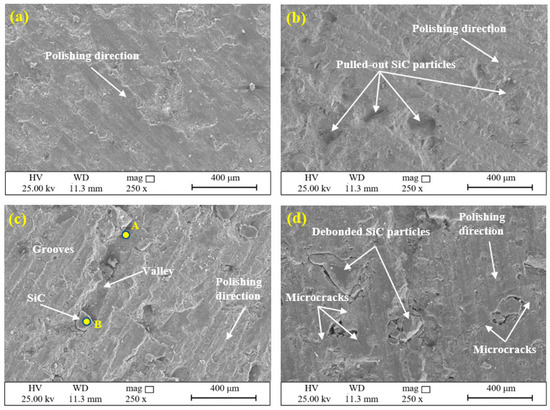 According to Figure 8a, at a pressure of 2.5 bar, the worn surface appeared relatively smooth and flat. Micro-ploughing and micro-cutting caused by the hard abrasive minerals could be seen on it. There were no deep grooves, and as a result, the subsurface remained intact. Moreover, the contribution of adhesive wear and delamination seems to be negligible; therefore, the amount of overall wear was low. Additionally, in this case, the dominant wear mechanism was abrasive wear. With increasing values of pressure, the friction and the plastic deformation on the worn surface increased, leading to the formation of some micro pits due to the detachment of SiC particles (Figure 8b). As can be seen in this figure, in addition to abrasive wear, adhesive wear and delamination, which had a greater impact than in the previous case, the formation of pits also had a further effect on the weight loss of the pin. Therefore, the amount of wear also increased. At a pressure of around 6.25 bar, the combination of abrasive, adhesive and delamination mechanisms considerably affected the wear loss of the pin. In this case, the subsurface of the pin was affected, and many deep grooves were created on the pin surface, thus further confirming the penetration of stone surface asperities. Sometimes, detached SiC particles from the pin became trapped between the contacting surfaces (three-body abrasive wear) before leaving the environment, sliding from point A to point B. As a result, valleys were created on the surface of the pin (Figure 8c). Finally, due to excessive load at a higher pressure of around 6.25 bar, the wear mechanisms were not completely formed. The debonded abrasive particles were not able to pull out from the pin surface, i.e., interlocking between the pin and the stone surface had occurred (Figure 8d), consequently decreasing the tool wear. Another noteworthy point in Figure 8d is the presence of microcracks that started and grew from the concentration points of stress. It is possible that, with increasing pressure, the microcracks will also increase, and their joining together will lead to the rupture of the pin. However, in polishing plants for building stones, pressures greater than 7.5 bar are rarely used. Therefore, in this study, no pressures greater than this were applied.