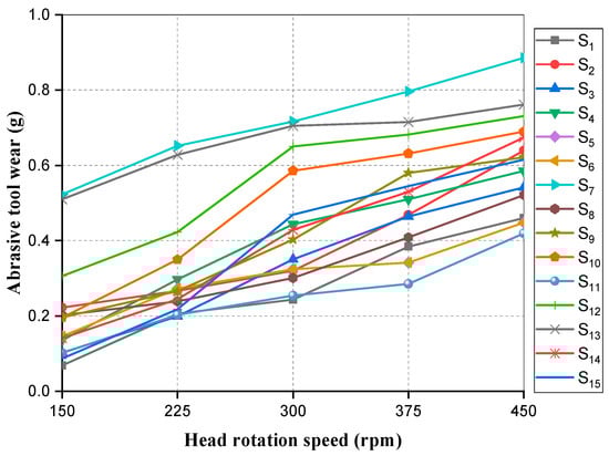 Variation in abrasive tool wear with head rotation speed.