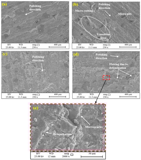 FESEM micrographs of the worn pin surfaces after performing the test on granodiorite stone (S2) with different head rotation speeds: (a) 150, (b) 225, (c) 375,(d) 450 rpm and (e) a close- up of delamination wear.