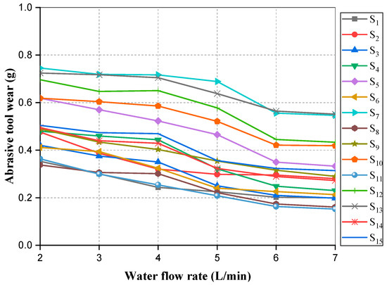 - When the water flow rate was increased to 5 L/min, there was a slight decrease in the wear of the abrasive tool, after which it dropped suddenly for almost all samples. Then, the wear of the abrasive tool remained nearly unchanged at water flow rates greater than of 6 L/min.