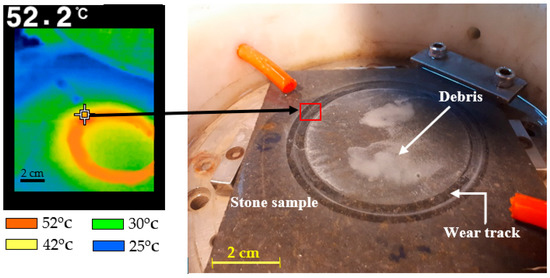 According to the observations performed during the tests at a low flow rate (2 L/min), the water was not able to completely flush away the wear debris (Figure 12). To better understand the reasons for the high weight loss at a flow rate of 2 L/min, the temperatures of the wear track were measured immediately after the test using a thermometer device (brand CEM, model: DT-8861). As shown in Figure 12, the temperature of the wear track increased to about 52 °C immediately after the test. Due to the inaccessibility of the wear track during the tests, the temperature was recorded after the test, i.e., during the cooling time of the wear track. It was obvious that the real temperature of the wear track during the test was greater than this value. Therefore, increasing the temperature and friction increases the plastic deformation at the pin surface, subsequently increasing the abrasive tool wear.