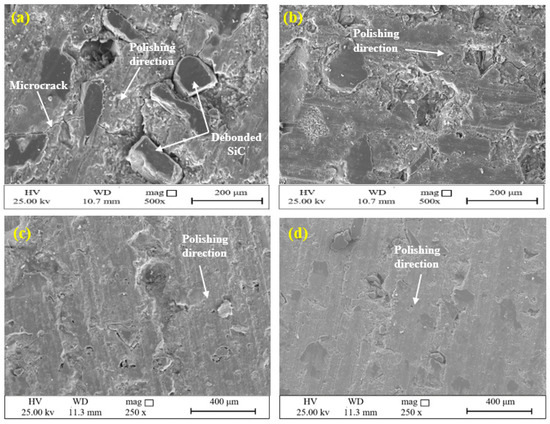 The FESEM micrographs of the worn pin surfaces at a low flow rate showed that there was insufficient water located between the pin and the stone surface; therefore, friction and interaction were increased. This resulted in an increase in the temperature of the tribo-system; there could also be in increase in the plastic deformations of the pin surface and its subsurface. According to Figure 13a,b, abrasive and adhesive wear can be regarded as the main mechanisms in the weight loss of the abrasive tools. However, due to high friction and adhesion, microcracks grew, and the silicon carbide particles of the pin were debonded from the surface earlier than scheduled. Therefore, there was an increase in the abrasive tool wear. In contrast, water was able to play its role properly at high flow rates, i.e., it was able to reduce friction and SiC particle debonding. With increasing water flow rate (Figure 13c,d), the adhesion wear mechanism transitioned to abrasive wear, i.e., the main mechanism was abrasive wear only. Therefore, the amount of abrasive tool wear decreased by 7 L/min, and remained nearly constant.