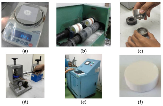 Manufacturing process of alumina insert. (a) Preparation of the alumina powders. (b) Blending process. (c) Mould preparation. (d) Pressing operation with Everest Analytical hydraulic handpress. (e) Cold isostatic pressing operation with AIP3-12-60CPA American Isostatic Presses. (f) Example of alumina compact prepared according to the required shape.