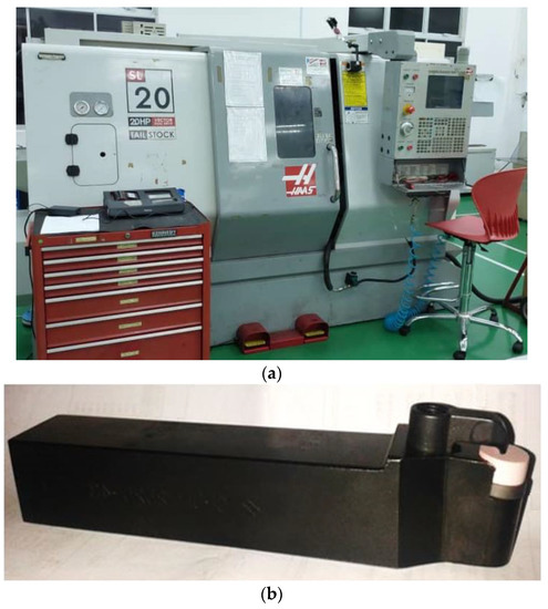 Machining trials were performed according to ISO 3685, which is a standard of tool life testing with a single point turning tools at varying cutting speeds and feed rates, as prescribed in Table 4. The selection of parameters such as the cutting speed, feed rate, and depth of cut was based on the range used by previous researchers as described in [9,16]. A Haas SL-20T CNC lathe machine was used to perform the turning operation, as shown in Figure 2a. The insert was clamped on the CRDN252543 tool holder as shown in Figure 2b. Figure 2c shows the setup for the machining trials.