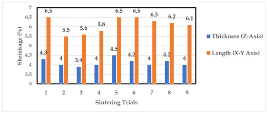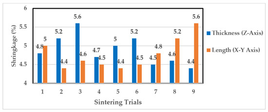 Figure 4 presents the shrinkage variation for an alumina insert with a trapezium shape after sintering with each of the nine sintering conditions listed in Table 1. Throughout the sintering trials, the alumina inserts with the trapezium shape had size reductions of up to 6.5% after sintering. The samples’ lengths (X–Y direction) showed more shrinkage than their thickness (Z direction). This is explained by more gaps or different particle packing along the larger top surface area of 14 mm × 14 mm for the trapezium sample, as compared to each side area (14 mm × 6 mm), which led to a higher tendency of densification along the top surface of the sample [19].