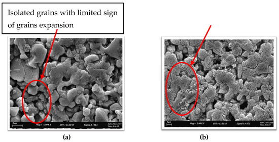 Figure 6 presents a more in-depth examination of the microstructure of the sintered alumina. The particles demonstrated isolated grains where the particles integrated in loose packing condition at the lower sintering temperature of 1200 °C (Figure 6a). Significant grain expansion was observed as the sintering temperature increased to 1400 °C (Figure 6b). This demonstrates that sintering at 1400 °C effectively suppressed the grain growth. In terms of the holding time, Figure 7 shows a comparison of the sintered microstructure from low and high holding times. The alumina clearly showed isolated grains with little sign of particle expansion (Figure 7a). When the holding time reached 9 h, the long heating time imparted high energy to the particles, causing them to expand until the grain size reached its limits (Figure 7b).