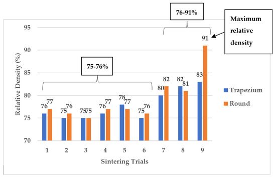 Distribution of the relative density according to the sintering trials of the alumina inserts.