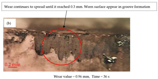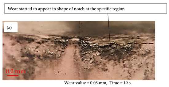 Figure 10 shows the wear development of alumina inserts at a 250 m/min cutting speed and a 0.15 mm/rev feed rate. The wear initiated at the flank area, where some portion of wear started to appear in the shape of notch at the specific region, as shown in Figure 10a. Further machining revealed that the wear spiked rapidly until it reached 0.96 mm within a short time of machining, as shown in Figure 10b. This demonstrates how the brittle nature of alumina was easily fractured from the first contact of the cutting tool with the workpiece material AISI 1045 carbon steel.