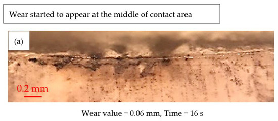 Further inspection of the wear region, pictured in Figure 10b and Figure 11c, showed the formation of grooves at the flank face of the wear area, in addition to a severe notch-shaped flank wear. The formation of such grooves reflected the abrasive wear at the contact region. When the detached ceramic particles trapped and rolled on the contact interface, the groove was formed. Furthermore, some hard particles from the workpiece materials may become detached, trapped, and rolled at the contact interfaces to form parallel ridges. The groove that formed inside the notch wear area allowed molten steel to attach and promote adhesive wear, which could hasten the cutting tool wear. Accumulation of groove formation results in significant material loss at the tool edge, facilitating easy fracture at the cutting tool’s edge [25,26,27].