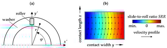 (a) Definition and location of coordinate systems; (b) schematic illustration of the velocity distribution in the contact area of the roller element and the raceway in a thrust roller bearing [2].