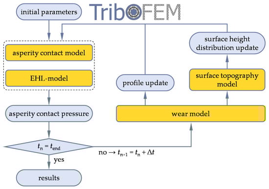 Figure 2 shows the flowchart of the numerical wear modeling in the mixed lubrication regime. The implemented calculation models, which are detailed in the following sections, are highlighted in yellow. Instead of a transient simulation, a stationary EHL model was solved for each time step in order to save computing time. The wear depth was then extrapolated over a constant time step Δt.