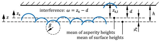 The asperity contact model of Jackson and Green [44,45,46] was implemented within the present study. The underlying model for the contact of a rough surface with a rigid plane is shown in Figure 3. In order to stochastically describe the surface roughness, surface measurements were performed by means of laser scanning microscopy on three different rollers and washers of the axial cylindrical roller bearing type 81212.