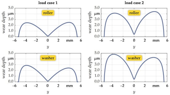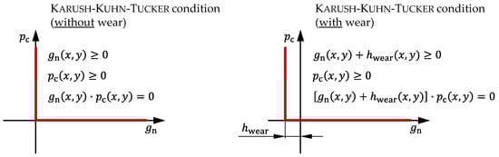 The consideration of the wear-related profile change in the contact simulation was achieved by an adaptation of the Karush–Kuhn–Tucker contact conditions, as depicted in Figure 8.