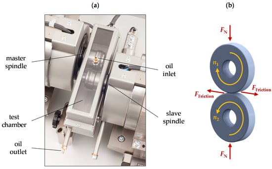 A two-disc tribometer—as depicted in Figure 9 was chosen as an experimental set-up to determine the wear coefficient as an input parameter for the numerical wear simulations. The tribometer consists of two independently driven spindles that rotate the test discs at a defined speed and press them against each other at a defined force. The contact between both discs is lubricated by circulating oil, which can be warmed up to a defined temperature by oil heating.