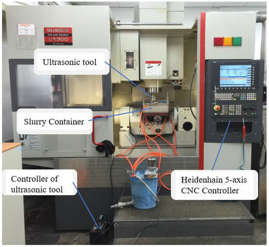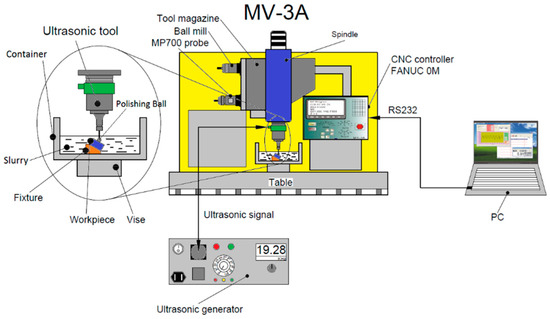The setup of the experiment for determining the optimal ultrasonic-vibration-assisted ball polishing process parameters is illustrated in Figure 2. The 5-axis machining center we used was fabricated by QUASER Co., (Taichung, Taiwan) type UX300, equipped with the CNC controller of HEIDENHAIN Company (Traunreut, Germany), type iTNC 530. To determine the origin coordinates of the specimen to be machined and perform the intermittent process measurement, a TS740 touch-trigger probe produced by HEIDENHAIN Company was integrated with the machining center tool magazine. The Unigraphics NX10 CAM software (NX10) was used to generate the NC codes required for fine milling, ball burnishing, and spherical polishing path after the simulation. These generated CNC codes were transmitted to the iTNC 530 controller of the machining center through RS232 serial interface. A slurry container with a simple circulation system stirred by an electrical motor was specially designed and mounted on the rotary table. An ultrasonic tool with a maximum vibration amplitude of 15 microns and a working frequency ranging from 18 to 27 kHz was integrated with the machine tool. The Hommelwerke T8000 roughness and contour tester, made by JENOPTIC (Jena, Germany), was used to measure the surface roughness of the fine-milled, burnished, and polished specimens.