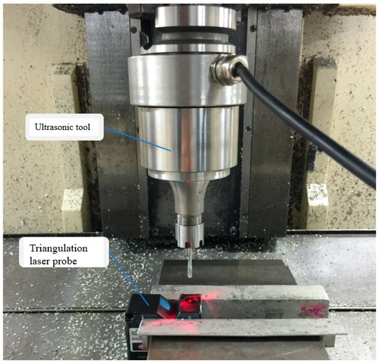 With the development of an ultrasonic tool with holder type BT40 that can be integrated into the tool magazine, the automated ultrasonic-vibration-assisted polishing on a machining center is possible, as shown in Figure 1. According to the literature survey, the optimal ultrasonic-vibration-assisted ball polishing parameters for STAVAX mold steel on a five-axis machining center, such as the vibration amplitude, working frequency, spindle speed, abrasive grain size, slurry concentration, depth of penetration, etc., have not been studied.