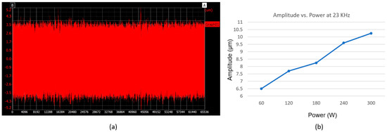 Measured results of the vibration amplitudes of the ultrasonic tool: (a) amplitude of the ultrasonic tool with the working frequency of 23 kHz and power of 300 W; (b) plot of amplitude vs. power.
