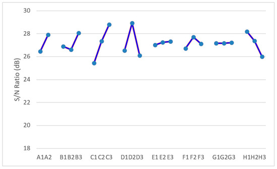 Using Equation (1), the S/N ratio of each L18 orthogonal array was calculated with respect to the surface roughness mean value Ra of three tests, as listed in Table 4, after the 18 matrix experiments were executed. The mean surface roughness value Ra ranged from 0.020 μm to 0.067 μm. This can be considered an approximate estimation of the improvement in surface roughness at the best and worst modes. The plot of the average S/N ratio for each level of the eight factors is shown in Figure 6. In general, they are the separate effects of each factor and called main effects. The calculated mean S/N ratio was 27.302 dB, and the mean surface roughness was 0.044 μm, according to the data in Figure 6.
