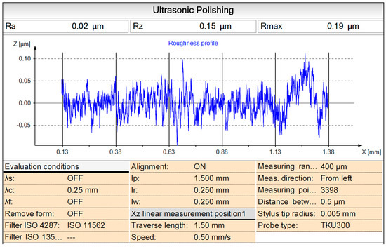 The optimal combination of the ultrasonic-vibration-assisted ball polishing parameters is summarized in Table 5. The amplitude of the ultrasonic tool was 10 μm; the working frequency of the ultrasonic tool was 23 kHz; the spindle speed was 5000 rpm; the diameter of the aluminum oxide (Al2O3) was 0.3 μm; the feed rate was 60 mm/min.; the stepover distance was 20 μm; depth of penetration was 180 μm; and the slurry concentration was 1:10.