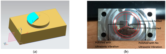The sequential fine milling, ball burnishing, and ultrasonic-vibration-assisted ball polishing processes were adopted in this study for the surface finishing of the specimens and test carrier. The STAVAX (Sweden) specimens were specially designed and manufactured such that they could be mounted on a Kistler (Winterthur, Switzland)dynamometer to measure the cutting force. The surface to be burnished or polished was divided into eight zones so that the average burnished or polished surface roughness value could be calculated from that of the eight zones. The burnished surface roughness of the fine-milled specimens was 0.122 um using the optimal ball burnishing parameters. The specimen to be polished was mounted on a fixture with an inclination angle of 45 degrees, as shown in Figure 3, to avoid the stagnation point of the polishing ball clamped on the ultrasonic tool.