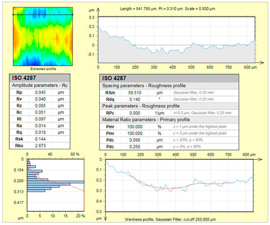 Three verification experiments were carried out to determine the repeatability of using the optimal combination of the spherical polishing parameters. The surface roughness of Ra = 22 nanometers (nm) on average, measured by the Hommelwerke (VS-Schwenningen, Germany) T8000 surface roughness measuring equipment, as shown in Figure 7, can be obtained based on the confirmation test results. The surface roughness improvement in the tested object from the burnished surface to the polished surface was about . Using the same polishing parameters without the ultrasonic vibration, the surface roughness of Ra = 28 nanometers on average can be obtained according to the test results. It could then be confirmed that the combination of the level for each factor was the set of optimal parameters for the ultrasonic-vibration-assisted ball polishing of STAVAX stainless mold steel.