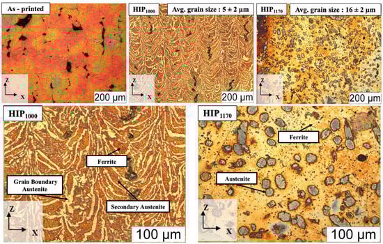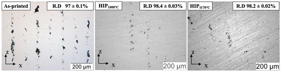 An increase in relative density of as-printed samples from 97 ± 0.1% to 98.4 ± 0.03% and 98.2 ± 0.02% was observed after HIP treatment at HIP1000 and HIP1170, respectively (See Figure 1). The polished optical micrograph of the as-printed L-PBF sample along the build direction ZX predominantly displayed irregular pores due to un-melted powders. The micrographs also showed larger irregular pores that are continuous across multiple layers, indicating a lack of fusion [14]. With HIP treatment, a reduction in the overall porosity in as-printed samples from over 5.4% to less than 0.1% was observed. Prior studies also reported a similar densification with concurrent closure of irregular pores upon HIP treatment of L-PBF-printed samples [11,16].