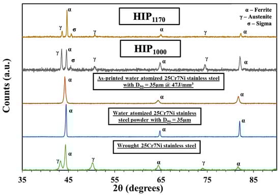 The XRD profile of the starting 25Cr7Ni stainless steel powder, as-printed L-PBF 25Cr7Ni sample, HIP1000, HIP1170 samples along with a wrought—annealed 25Cr7Ni stainless steel are collated and compared in Figure 2. The XRD analysis shows evolution of duplex microstructure in the HIP-treated samples (ferrite 2θ = 44°, 64°, 81°, austenite 2θ = 43°, 50°, 74°). In comparison to the as-printed samples showed peaks corresponding to only ferrite phase. In addition, the HIP-treated samples also exhibited peaks that correspond to tetragonal σ (2θ = 45.3°) phase. Prior studies also reported observing the presence of tetragonal σ phase in HIP-treated samples [23,24].