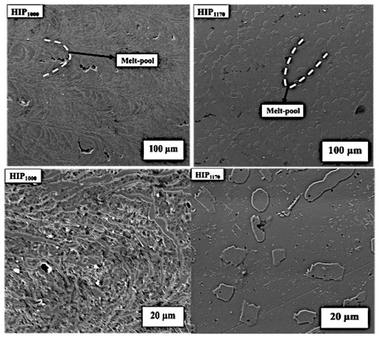The SEM micrographs of the electro-etched samples is shown in Figure 4. The micrographs revealed selective etched/smooth regions of ferrite and un-etched/raised regions of austenite [26]. The micrographs also showed precipitates within the austenite grains of HIP1000 samples. However, no significant precipitates were observed in the HIP1170 samples. The presence of precipitates within the austenite grains could corelate to the identification of the σ phase in the XRD analysis of the HIP1000 samples in the present study [23,27].
