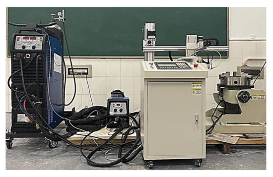 As a substrate, 304 SS with a size of 200 mm × 100 mm × 10 mm was used. The Fe50Mn30Cr10Ni10 (HEA) welding wire with Φ1.6 mm was used as AM material. The chemical compositions of HEA welding wire are Fe 50%, Mn 30%, Cr 10% and Ni 10% (at.%). We used silicon carbide abrasive paper with grit number 400 to ground the substrate and cleaned it with a mixing solvent of 15% acetone and 85% alcohol before additive manufacturing. A WSM-400R inverter pulse argon arc welding machine (CHU cutting, Shanghai, China) equipped with EWM THTRIX drive 4L wire feeder was employed to prepare the sample, as seen in Figure 1. The optimized AM process parameters were set according to Table 1.