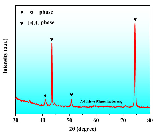 Figure 2 presents the XRD pattern of AM HEA. The FCC phase and σ phase were detected. The σ phase was formed by using this method, which was different from the alloy prepared by other methods [13].