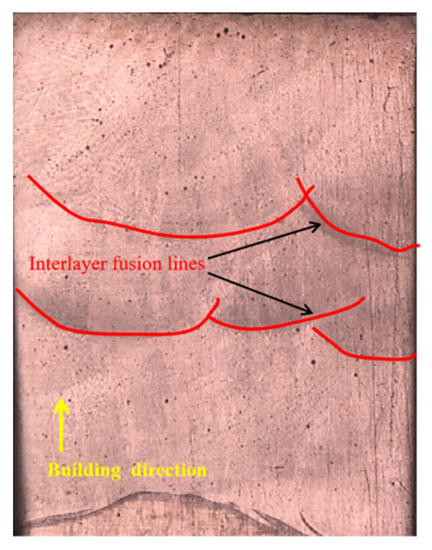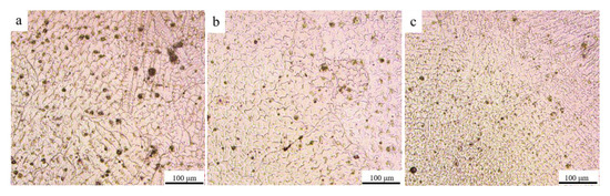 The microstructure of the specimen was analyzed. The cross-sectional morphology is shown in Figure 3, where fusion lines can be seen between the layers. Figure 4 shows the microstructures of AM HEA. The microstructure of the AM HEA is dendritic, with dendritic tissue in the bright white area and inter-dendritic structures in the dark gray area. Figure 4a–c shows the microstructure from the bottom to the top of the additive manufacturing. It can be seen that the grain size gradually decreases from the bottom to the top, which may be related to the heat dissipation of the surface. According to the report in Ref. [14], the shape of the crystal grain is highly related to the degree of subcooling ΔT, the solidification rate R, the temperature gradient Tg and the diffusion coefficient DL during the solidification. According to the different relationship of Tg, R, ΔT and DL, in (1) Tg/R > ΔT/DL, the crystal is a columnar structure, and in (2) Tg/R < ΔT/DL, the crystal is a plane equiaxed structure. The center temperature of the molten pool is high, the temperature gradient Tg is the largest, the temperature at the edge position is low and the edge position speed is much greater than the center of the molten pool during heat dissipation; thus, the edge solidification rate R and the degree of subcooling ΔT are relatively large. Therefore, from the center to the edge of the molten pool, Tg/R gradually decreases, ΔT/DL gradually increases and the crystal grains gradually transform from dendritic to equiaxed.