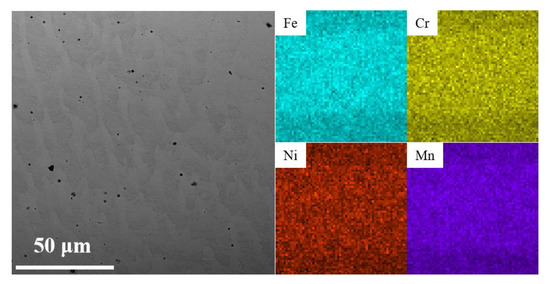 To further analyze the element distribution of the AM HEA, the EDS mappings were performed, and the results are shown in Figure 5 and Table 2. It can be seen that the microstructure of the AM HEA is dendritic, consisting of dendrites and inter-dendrites. The elements are uniformly distributed in the AM HEA, and the elemental percentage is also basically distributed according to the welding wire.