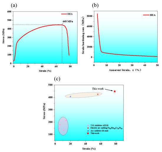 The mechanical properties were tested at room temperature and their engineering tensile stress-strain curves were presented in Figure 6a. As seen, the ultimate tensile strength (UTS) of the AM HEA was about 448 MPa. Surprisingly, the fracture strain (FS) was close to 80%, which shows very excellent plasticity. In order to further reveal the work hardening responses of the material, the strain-hardening rate was plotted in Figure 6b. Obviously, the AM HEA shows a monotonic two-stage decrease, and the two-stage hardening response was universally discerned in alloys closely related to dislocations configurations. At the initial strain hardening stage, the rapid decline implies a typical dislocation-hardening nature depicted by the classical Taylor model [15,16,17]. In Figure 6c, it is clear that the mechanical properties of this work are better than HEA preparation by electric arc melting and aluminum alloy, which indicates that the additive manufacturing technology proposed in this work has an important engineering application value [13,18].