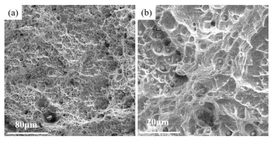 Figure 7 shows the fracture morphology of AM HEA after tensile testing. A large number of dimples were observed in AM HEA, which indicated that AM HEA displayed a typical plastic fracture. Therefore, it exhibits a greater tensile strain during the tensile process. The generation of these dimples were mainly due to the stress concentration generated by defects such as pores and inclusions present inside the specimen during the tensile process. When the loading reaches the yield limit of the material, the material begins to deform plastically, forming a crack source at the defect and expanding to form a tough nest-like fracture morphology.