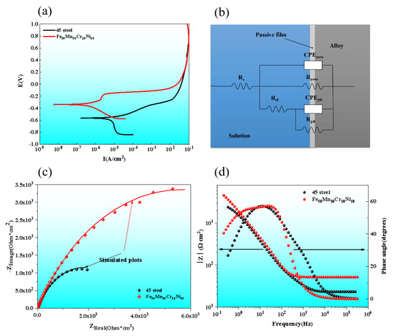 Polarization curves and EIS curves of HEA AML and 45 steel tested in 3.5 wt.% NaCl solution. (a) Polarization curves; (b) Nyquist plots; (c) bode plots; (d) equivalent circuit of EIS.