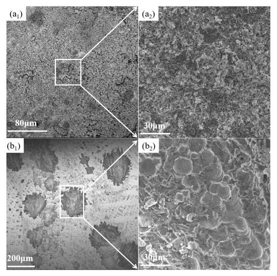The micro-morphology of AM HEA and 45 steel in different states after potentiodynamic polarization in 3.5 wt.% NaCl solution was captured. As seen in Figure 9a1,b1, the pitting pits and corrosion products appeared on the surface of AM HEA and 45 steel to different degrees. It can be seen from Figure 9a1,a2 that the entire surface of the 45 steel was corroded, and many corrosion products appear on the surface. However, the corrosion area of AM HEA was smaller, and the corrosion form was pitting corrosion. Figure 9b2 shows a uniform and dense microstructure in the pitting pits. This indicated that a passivation film was formed during the corrosion process, preventing further corrosion of the alloy. This did not occur in 45 steel, further indicating that the corrosion resistance of AM HEA is better than 45 steel.