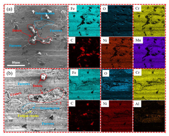 Worn surface morphologies and corresponding EDS mappings of AM HEA. (a) Steel ball-100N; (b) Al2O3 ball-100N.