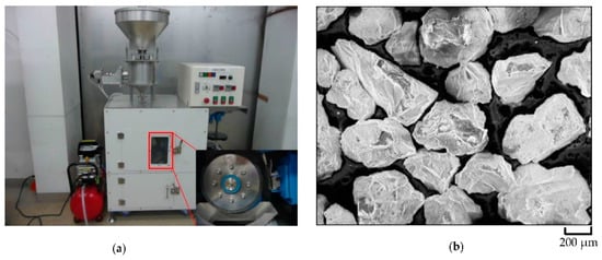 (a) Three-body abrasion machine test according to ASTM G65. (b) Abrasive particles (, 300 µm).