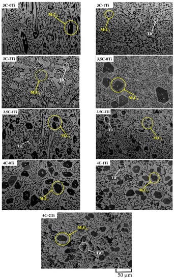 - The addition of Ti causes the M7C3 carbides in the microstructure to become finer and TiC to crystallize. The hike in Ti content results in a decrease in the microstructure hardness.