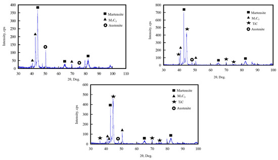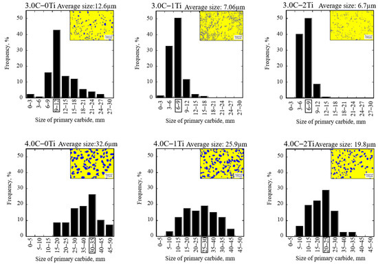The microstructure of materials such as HCCI is one of the most significant factors in analyzing the wear properties of the material. On that account, the test materials were individually etched in 5% nitro-hydrochloric acid for 6 min, followed by observation using the scanning electron microscope. The microstructures of all nine specimens are displayed in Figure 2. It is illustrated by the images that a substantial number of carbides are precipitated in the microstructure. It is shown that irrespective of the percentage of C or Ti, primary eutectic carbide M7C3 precipitates in all the specimens. Previously, several studies [32,33,34,35] have been carried out to demonstrate the shape of the M7C3 carbide. It has been found that the M7C3 carbide comprises a hexagonal bravais lattice owing to its hexagonal shape; however, in particular instances, an orthogonal crystal structure can be noticed. With the addition of Ti, TiC starts to appear. The precipitation of TiC has an apparent impact on M7C3 carbide. The amount of M7C3 carbides begins to decline as a consequence of the rising percentage of Ti. The cause behind the falling amount of M7C3 carbide is the behavior of Ti to precipitate ahead of M7C3; hence, Ti consumes C in the first instance. The deficiency of C to form M7C3 leads to the shortfall of M7C3. The amount of M7C3 starts to decrease with the precipitation of TiC, and the size of the M7C3 carbide shrinks as well. Figure 3 shows the carbide size distribution. It illustrates a downward trend in the average particle size, with values of 12.6, 7.06, and 6.7 µm for the Ti contents of 0, 1, and 2 wt.%, respectively, in the case of 3wt.% C. The same trend is also observed for 3.5 and 4 wt.% C. The possible phenomenon to shrink or refine M7C3 carbide is that when the Ti starts to consume the C, the affability of the C content in the iron melt is low for chromium carbide, resulting in the refinement of M7C3. A previous study is in good agreement with this present study [11]. However, a reverse occurrence is observed when the test materials are enriched with a higher percentage of C. With an enhancement of the C content, the number of M7C3 carbides starts to escalate. The amount of M7C3 starts to increase with an increase in the C content, and the size of the M7C3 carbide increases as well. A trend in the size enhancement of M7C3 is observed. The average particle size is 12.6 and 32.6 µm for the C content of 3 and 4 wt.%, respectively, in the case of 0 wt.% Ti. A similar trend is also observed for 1 and 2 wt.% Ti specimens. A plausible explanation for this occurrence is the strong carbide-forming behavior of Cr. A higher percentage of C is segregated by the higher amount of Cr. In addition, the stoichiometry of M7C3 might adequately increase the amount of M7C3 and increase the size. Figure 4 shows the X-ray diffraction (XRD) pattern of 3.5 wt.% C specimens.