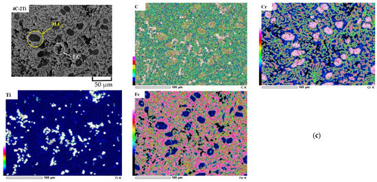The carbide precipitation characteristics of 27 Cr appear to be compactly dispersed. The dispersion of the supplemented transition metal in the microstructure is challenging to identify. That being so, the 4 wt.% C test specimens with 0, 1, and 2 wt.% Ti were analyzed by EDS mapping. The results are illustrated in Figure 5a–c. It can be found from the microphotographs of the SEM-EDS images that the dark carbides are predominantly inhabited by Cr. A dense distribution approach of M7C3 increases with the increase in C content. However, the reverse behavior is noticed with the increase in Ti content. The inadequacy of M7C3 is because of the advanced precipitation of TiC. The higher percentage of C and Ti results in the agglomeration of TiC due to the greater affability of C.
