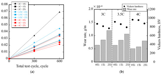 To investigate abrasive wear characteristics, three-body abrasive wear tests were performed. Figure 6a illustrates the abrasive wear performance as a function of wheel rotation, where the X-axis indicates the total test cycle, and the Y-axis indicates the amount of wear loss. The results show that each of the test specimens undergoes a similar wear loss tendency where the material loss escalates with the increase in the wheel cycles. Among all the specimens, the 4C-0Ti exhibited the lowest wear loss; however, with the increase in Ti content and the decrease in C content, the amount of wear loss increases. The basis behind the remarkable wear resistance performance of 4C-0Ti is thought to be its higher hardness. Figure 6b depicts the relationship between the wear rate and the hardness of each specimen. The dot plot illustrates the hardness, and the bar graph shows the wear rate. It can be seen that the amount of wear decreases as the hardness of each specimen increases. The C content plays a major role in influencing the Vickers hardness value, hence minimizing the wear rate, according to the graph. The specimens with 4 wt.%C demonstrated the lowest wear rate in comparison with each C content. However, the wear rate of the 4C specimens increased with increasing Ti content. The specimens with lower C content and higher Ti content led to a lower Vickers hardness, resulting in poor wear resistance. This finding is in good agreement with a previous study [41].
