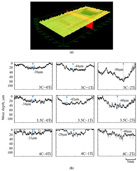 To comprehend the wear phenomenon more explicitly, the wear depth of each test specimen was investigated using a 3D laser microscope, which is illustrated in Figure 10a,b. The result shows that an increase in Ti content leads to a greater wear depth. On the contrary, an increase in C content results in a shallower wear depth. It was identified that with an escalating wear rate, the depth of wear tends to be deeper. Among all the test specimens, 4C-0Ti was confirmed to have the lowest wear depth.